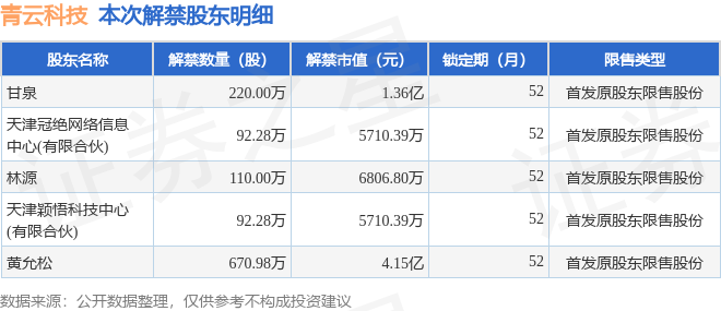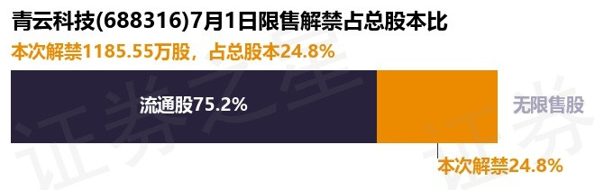 证券之星消息,根据市场公开信息整理,青云科技(688316)于7月1日将有1185.55万股限售股份解禁,为公司首发原股东限售股份,占公司总股本24.8%。(本次数据根据历史公告整理得出,实际情况以上市公司最新公告为准)本次解禁后,公司已无限售股份。具体如下图所示: